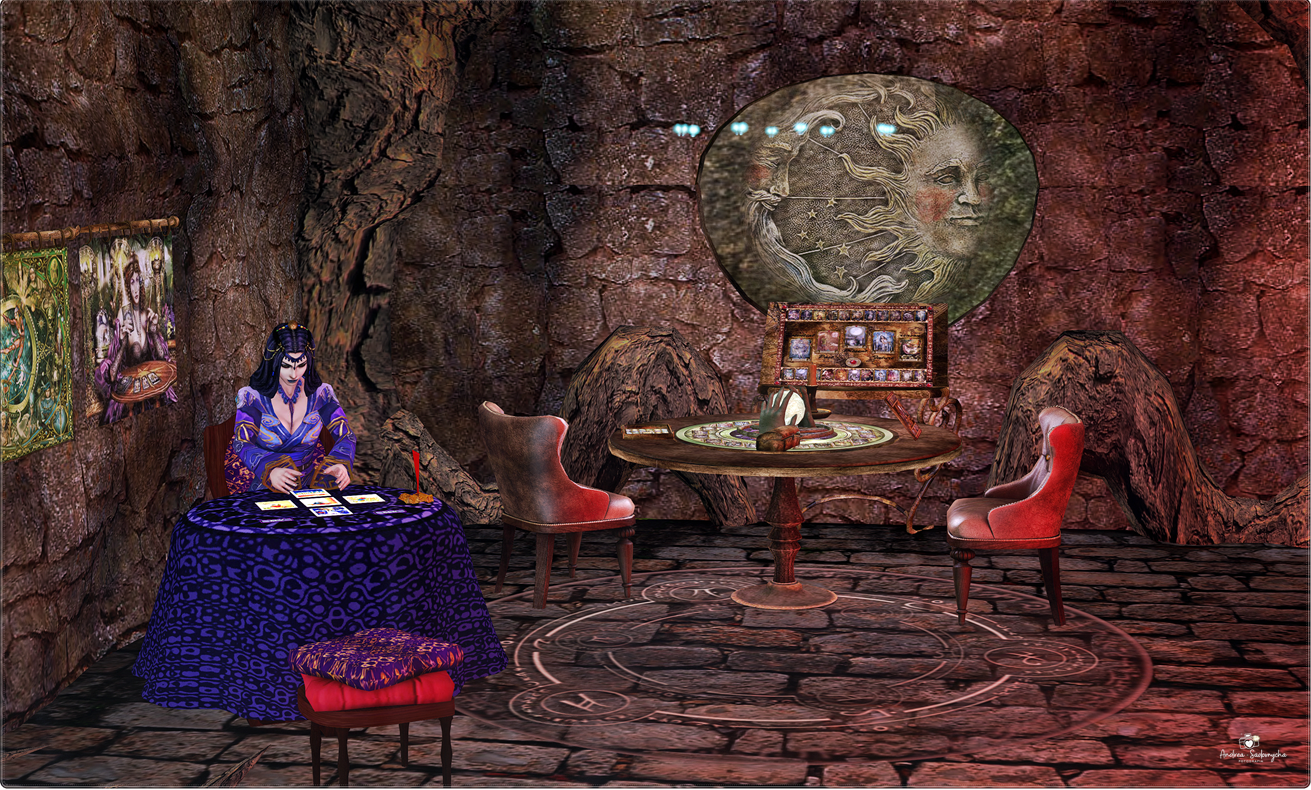 Seguindo pela exploração, a ilha muda completamente de tom. Uma gruta abriga a leitura de tarô, com ambientação esotérica e simbólica, enquanto outra área presenta um laboratório de alquimia, com experimentos e elementos que remetem à transformação e à ciência fantástica. Aqui, o foco deixa de ser visual e passa a ser conceitual.