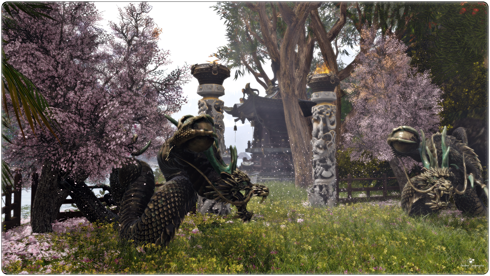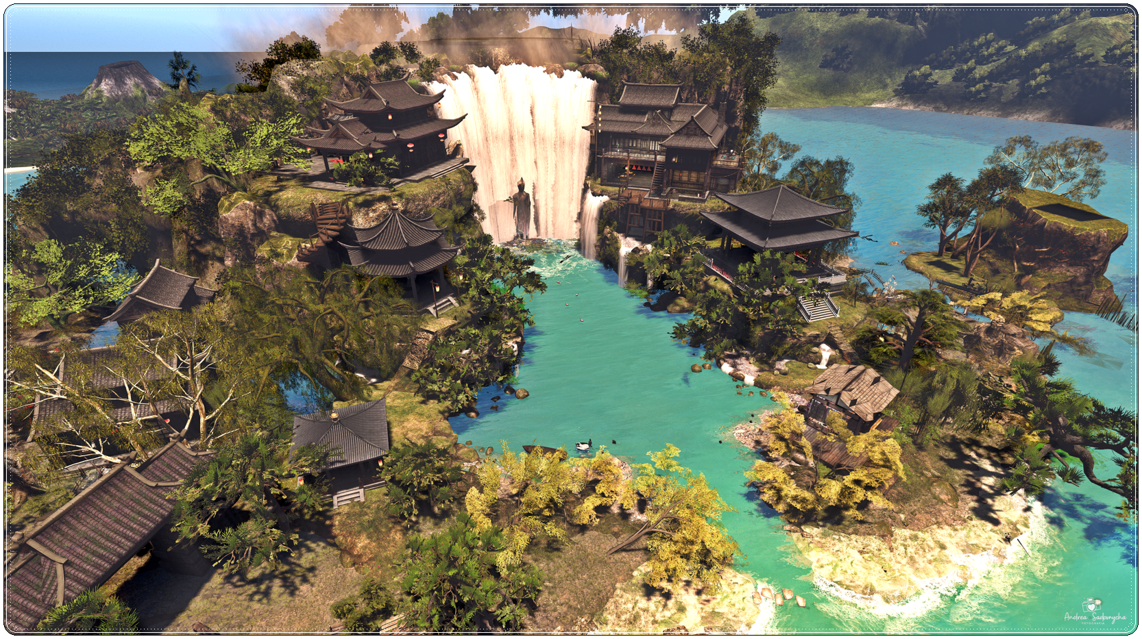 Ao redor, construções em estilo oriental se distribuem de forma harmoniosa, criando uma sensação de profundidade e descoberta. Cada novo ângulo revela um detalhe, seja uma ponte, um telhado curvado ou um pequeno caminho escondido.