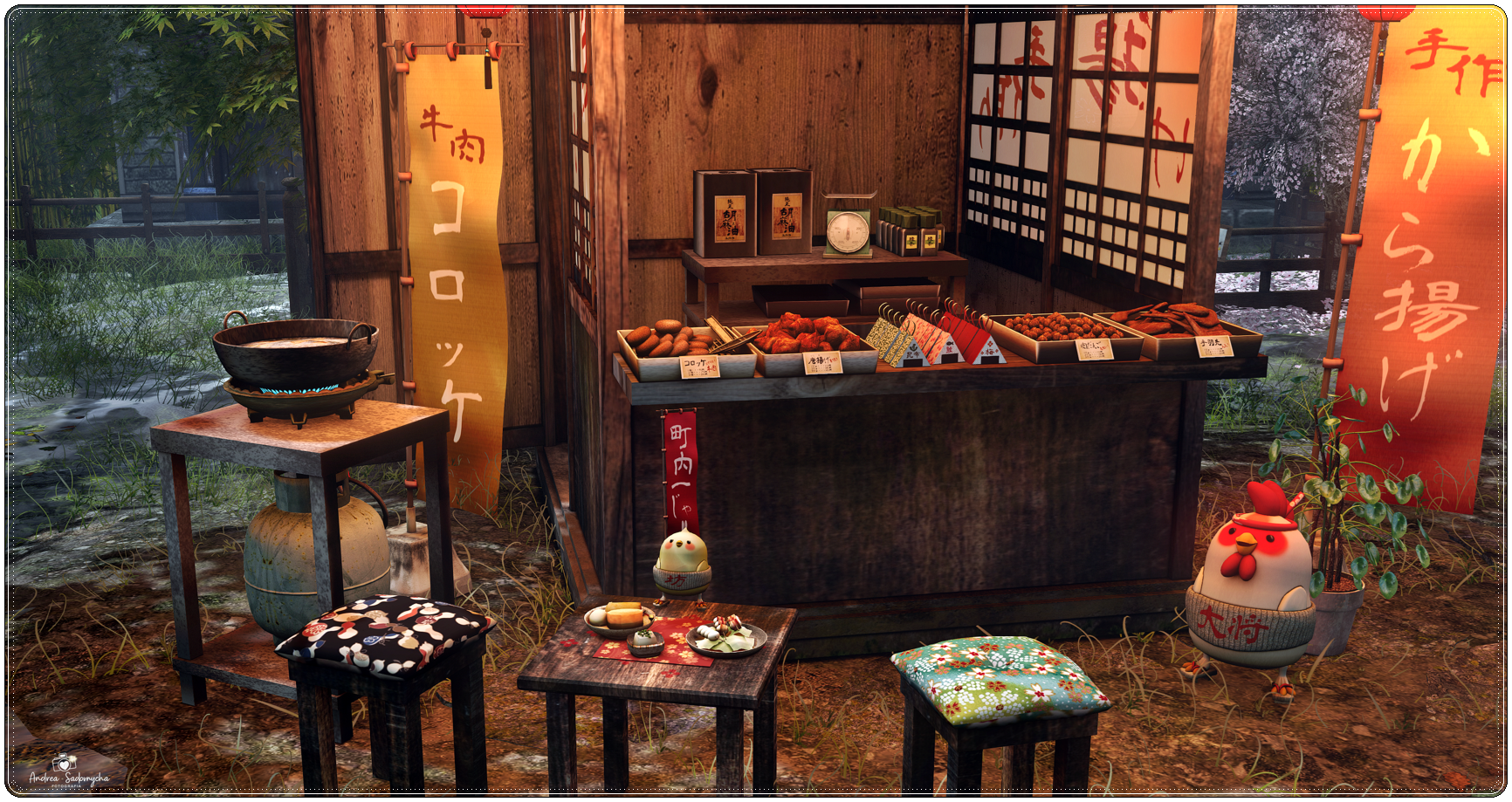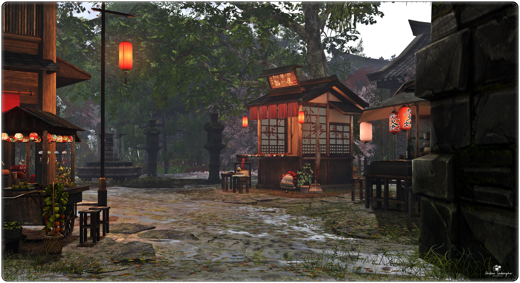 Detalhes como lanternas, vegetação densa e elementos decorativos reforçam a identidade do lugar e ampliam a sensação de imersão. Além de um restaurante para descansar e interagir com RP.