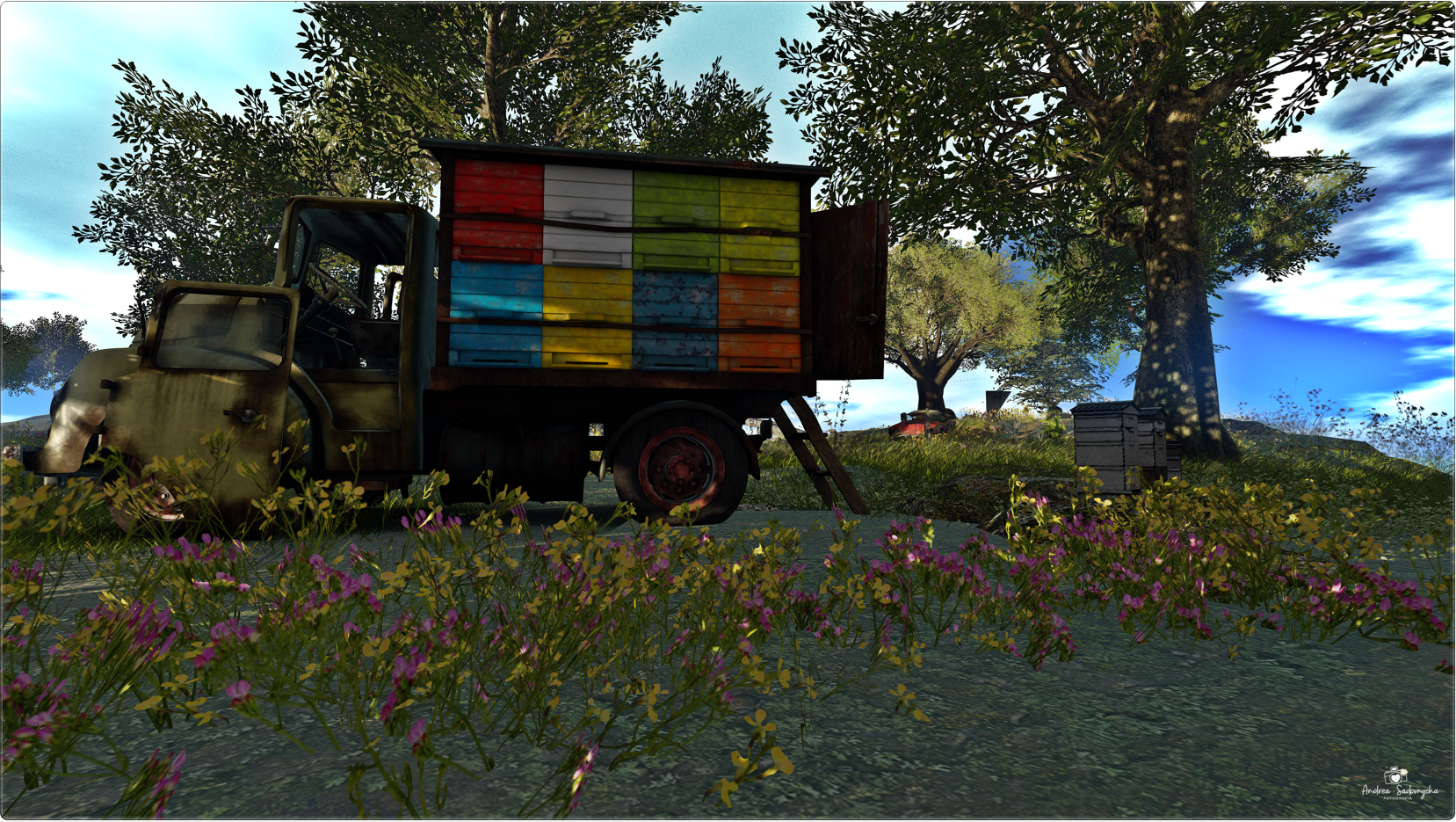 - o caminhão antigo com colmeias coloridas
