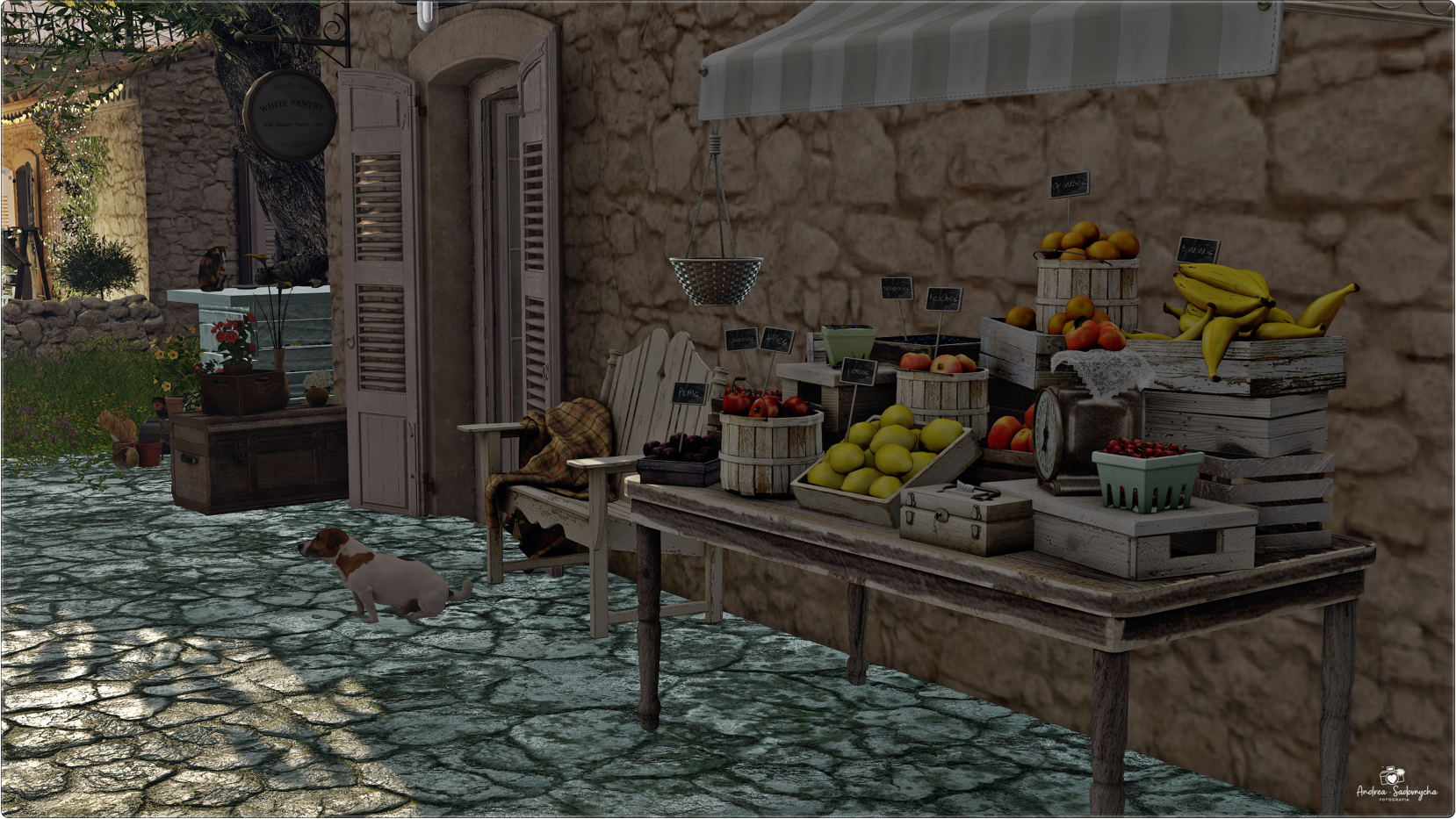 - pequenos mercados com frutas e objetos detalhados