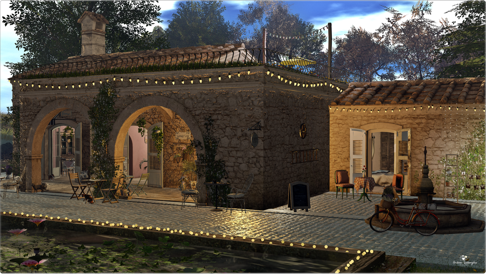 - vilas de pedra com iluminação quente ao entardecer